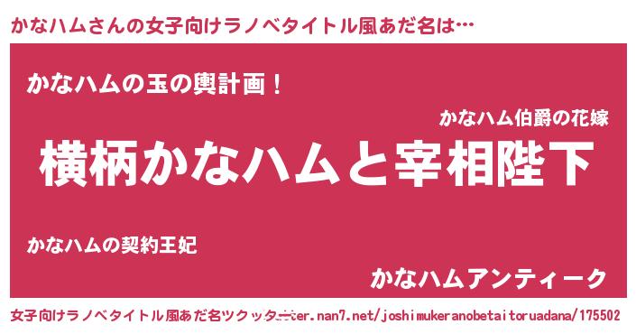 | 男性向けラノベタイトル風あだ名 | 『かなハムに滅ぼされるだけの簡単なお仕事です』 |