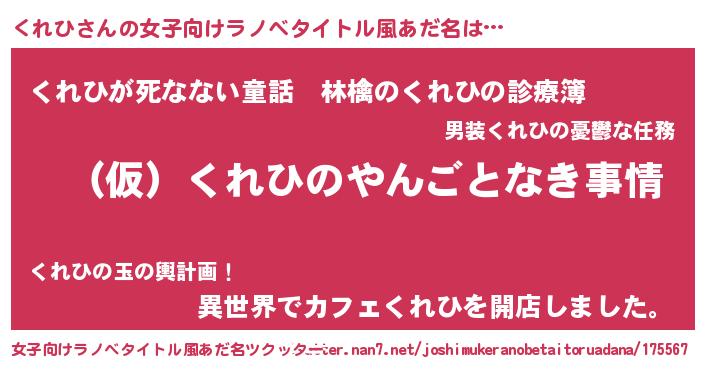 | 男性向けラノベタイトル風あだ名 | 『くれひの憂鬱』『魔弾の王とくれひ』 |