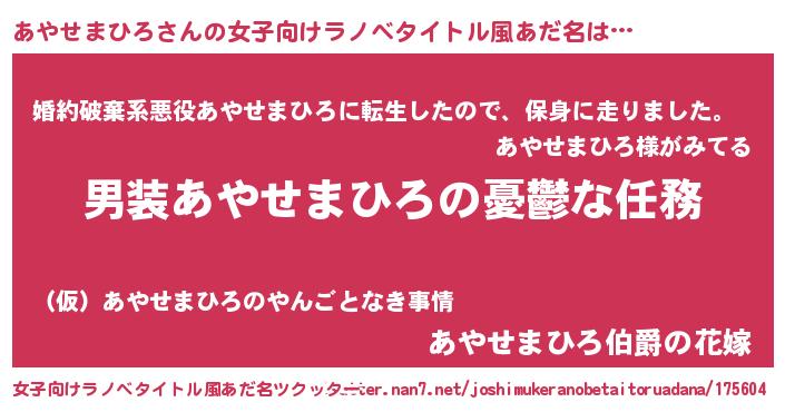 | 男性向けラノベタイトル風あだ名 | 『うちのあやせまひろが世界を掌握している!』 |