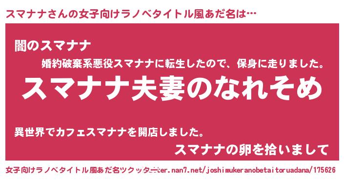 | 男性向けラノベタイトル風あだ名 | 『おまえをオタクにしてやるから、俺をスマナナにしてくれ! 』 |