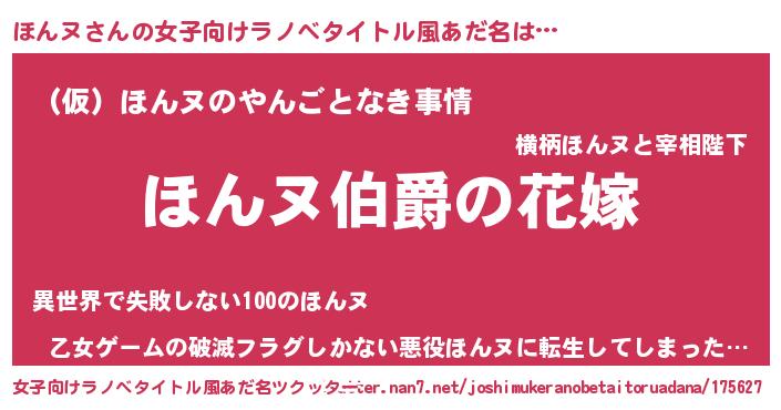 | 男性向けラノベタイトル風あだ名 | 『うちの娘の為ならば、俺はもしかしたらほんヌも倒せるかもしれない。』 |