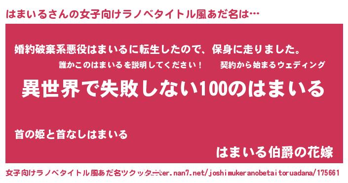 | 男性向けラノベタイトル風あだ名 | 『はまいるという概念が存在しない退屈な世界 』 |