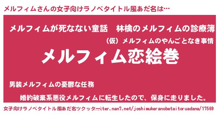 | 男性向けラノベタイトル風あだ名 | 『おまえをオタクにしてやるから、俺をメルフィムにしてくれ! 』 |