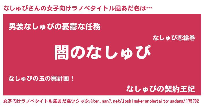 なしゅびさんの女子向けラノベタイトル風あだ名は… 『闇のなしゅび』『男装なしゅびの憂鬱な任務』『なしゅびの契約王妃』 ツクッター #女子向けラノベタイトル風あだ名ツクッター http://tkutter.nan7.net/joshimukeranobetaitoruadana/175702/