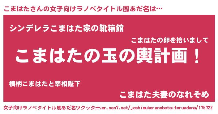 | 男性向けラノベタイトル風あだ名 | 『こまはた~年齢イコール彼女いない歴の魔法使い~』 |