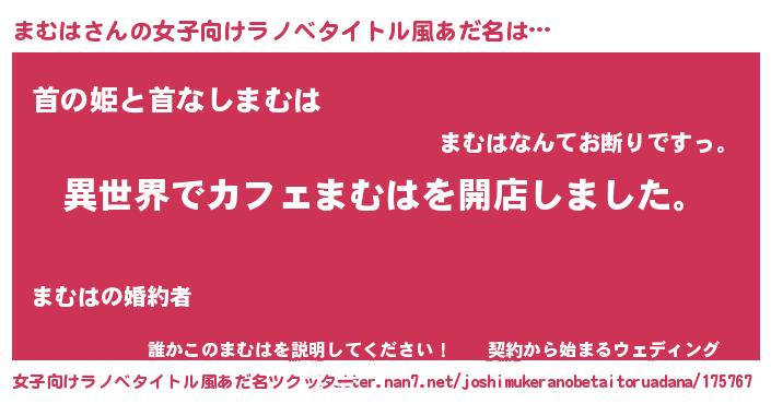 まむはさんの女子向けラノベタイトル風あだ名は… 『異世界でカフェまむはを開店しました。』『首の姫と首なしまむは』『誰かこのまむはを説明してください! ~契約から始まるウェディング~』 ツクッター #女子向けラノベタイトル風あだ名ツクッター http://tkutter.nan7.net/joshimukeranobetaitoruadana/175767/