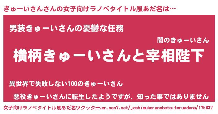 | 男性向けラノベタイトル風あだ名 | 『きゅーいさんに滅ぼされるだけの簡単なお仕事です』 |