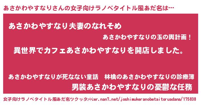 | 胡散臭い通販商品みたいなあだ名 | 『前代未聞の水素水…その名も「あさかわやすなり」』 |