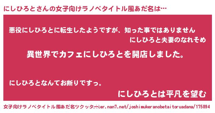 | 男性向けラノベタイトル風あだ名 | 『誰もが恐れるあのにしひろとが、ぼくの専属メイドになるようです。』 |