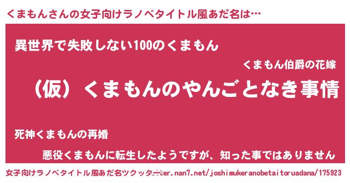 | 男性向けラノベタイトル風あだ名 | 『くまもんの憂鬱』 |