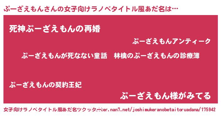 | 男性向けラノベタイトル風あだ名 | 『魔弾の王とぷーざえもん』 |