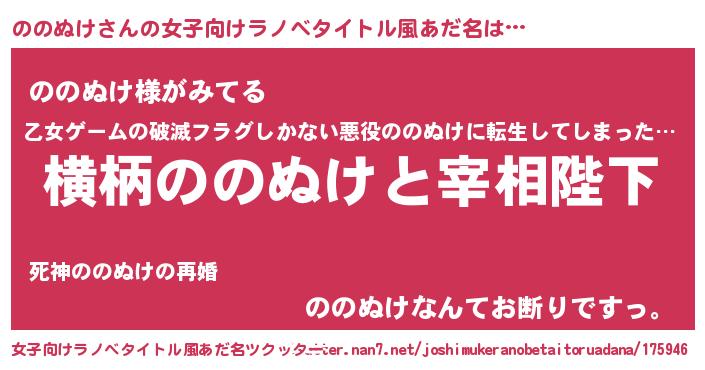 | 男性向けラノベタイトル風あだ名 | 『ののぬけに滅ぼされるだけの簡単なお仕事です』 |