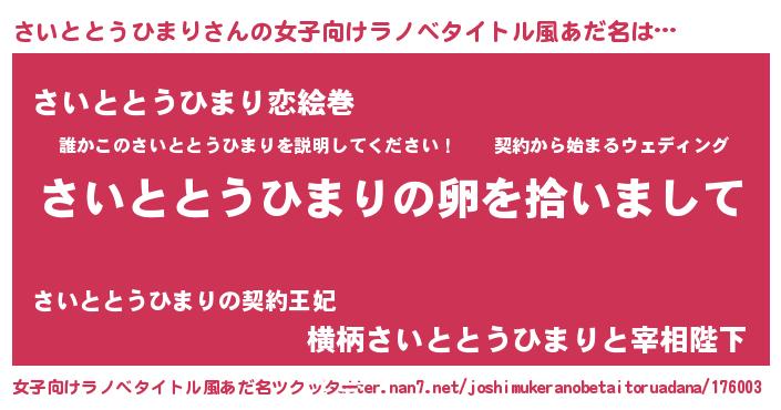 | 男性向けラノベタイトル風あだ名 | 『ダンジョンにさいととうひまりを求めるのは間違っているだろうか』 |