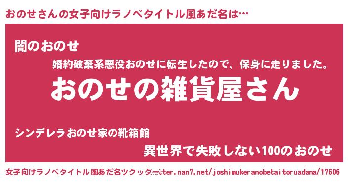 | 男性向けラノベタイトル風あだ名 | 『やはりおのせの青春ラブコメはまちがっている 』 |