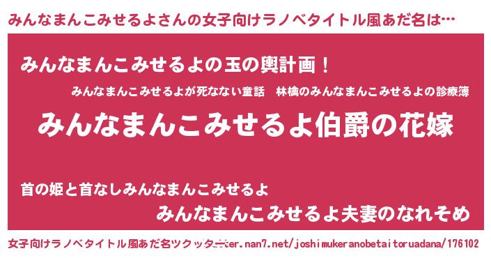 | ファンタジー風あだ名 | 『エターナルミンナマンコミセルヨー』 |
