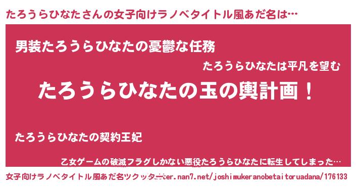 | 男性向けラノベタイトル風あだ名 | 『たろうらひなた~年齢イコール彼女いない歴の魔法使い~』 |