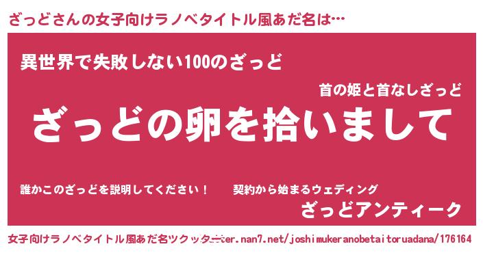 | 男性向けラノベタイトル風あだ名 | 『ざっどの嫁は女の子じゃないと思った?』 |
