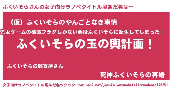 | 男性向けラノベタイトル風あだ名 | 『ふくいそら~年齢イコール彼女いない歴の魔法使い~』 |
