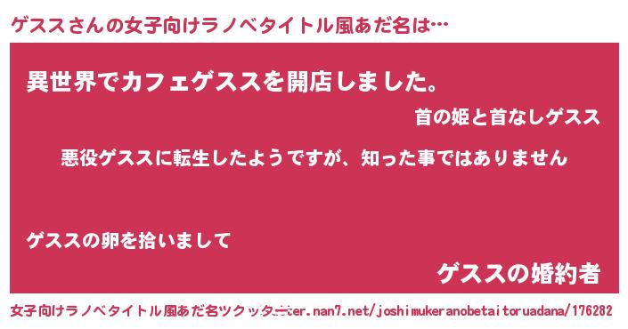 | 男性向けラノベタイトル風あだ名 | 『この素晴らしい世界にゲススを!』 |