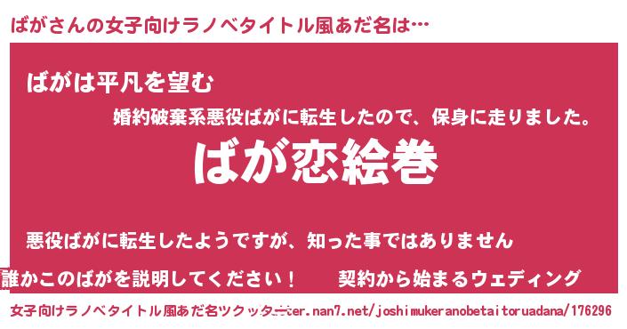 | 男性向けラノベタイトル風あだ名 | 『おまえをオタクにしてやるから、俺をばがにしてくれ! 』 |