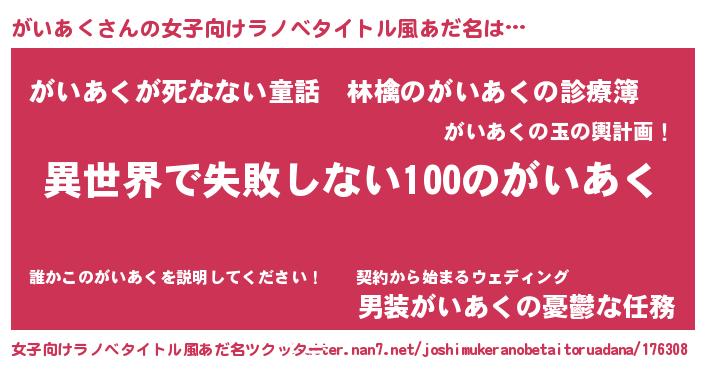 | 男性向けラノベタイトル風あだ名 | 『がいあくという概念が存在しない退屈な世界 』 |