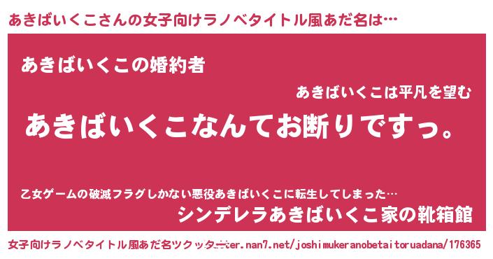 あきばいくこさんの女子向けラノベタイトル風あだ名は… 『あきばいくこなんてお断りですっ。』『あきばいくこの婚約者』『シンデレラあきばいくこ家の靴箱館』 ツクッター #女子向けラノベタイトル風あだ名ツクッター http://tkutter.nan7.net/joshimukeranobetaitoruadana/176365/