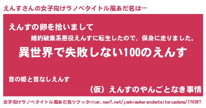| 男性向けラノベタイトル風あだ名 | 『えんすという概念が存在しない退屈な世界 』 |