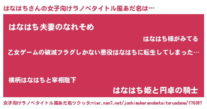 | 男性向けラノベタイトル風あだ名 | 『魔弾の王とはなはち』『はなはちの憂鬱』 |