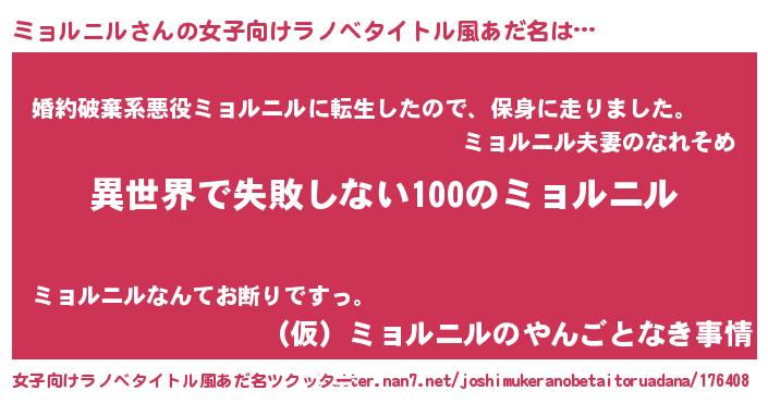 ミョルニルさんの女子向けラノベタイトル風あだ名は… 『異世界で失敗しない100のミョルニル』『婚約破棄系悪役ミョルニルに転生したので、保身に走りました。』『(仮)ミョルニルのやんごとなき事情』 ツクッター #女子向けラノベタイトル風あだ名ツクッター http://tkutter.nan7.net/joshimukeranobetaitoruadana/176408/