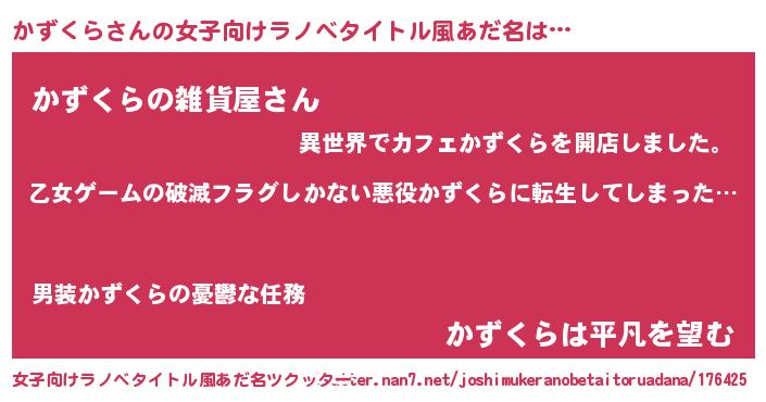 | 男性向けラノベタイトル風あだ名 | 『この素晴らしい世界にかずくらを!』 |