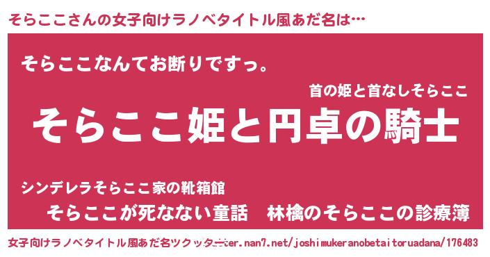 | 男性向けラノベタイトル風あだ名 | 『そらここの憂鬱』『魔弾の王とそらここ』 |