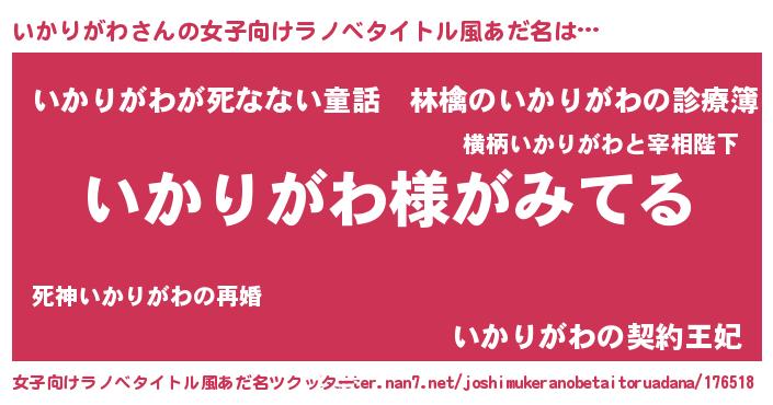 | 男性向けラノベタイトル風あだ名 | 『いかりがわの嫁は女の子じゃないと思った?』 |