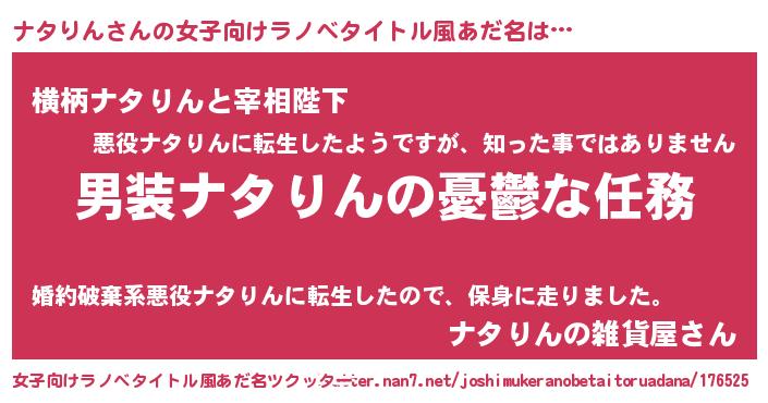 | 男性向けラノベタイトル風あだ名 | 『うちのナタりんが世界を掌握している!』 |