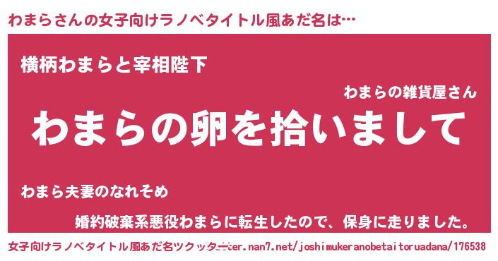 | 男性向けラノベタイトル風あだ名 | 『わまらの嫁は女の子じゃないと思った?』 |