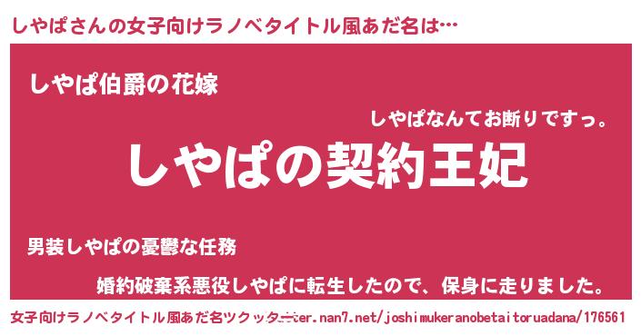 | 男性向けラノベタイトル風あだ名 | 『しやぱという概念が存在しない退屈な世界 』 |