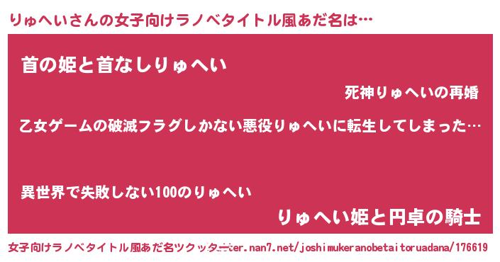 | 男性向けラノベタイトル風あだ名 | 『この素晴らしい世界にりゅへいを!』 |