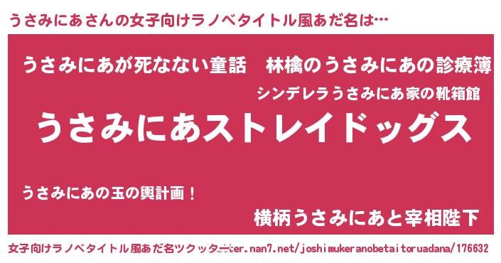 | 男性向けラノベタイトル風あだ名 | 『Re:うさみにあから始める異世界生活』 |
