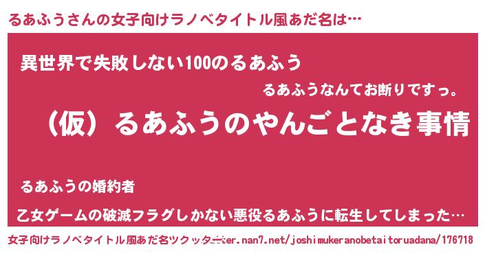 るあふうさんの女子向けラノベタイトル風あだ名は… 『(仮)るあふうのやんごとなき事情』『異世界で失敗しない100のるあふう』『乙女ゲームの破滅フラグしかない悪役るあふうに転生してしまった…』 ツクッター #女子向けラノベタイトル風あだ名ツクッター http://tkutter.nan7.net/joshimukeranobetaitoruadana/176718/