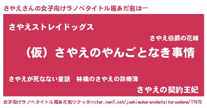 | 男性向けラノベタイトル風あだ名 | 『さやえの憂鬱』『魔弾の王とさやえ』 |