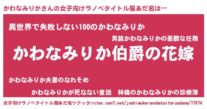 | 男性向けラノベタイトル風あだ名 | 『やはりかわなみりかの青春ラブコメはまちがっている 』 |