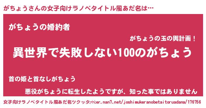 がちょうさんの女子向けラノベタイトル風あだ名は… 『異世界で失敗しない100のがちょう』『がちょうの婚約者』『悪役がちょうに転生したようですが、知った事ではありません』 ツクッター #女子向けラノベタイトル風あだ名ツクッター http://tkutter.nan7.net/joshimukeranobetaitoruadana/176756/