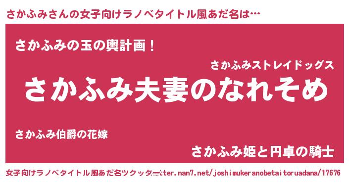 | 男性向けラノベタイトル風あだ名 | 『おまえをオタクにしてやるから、俺をさかふみにしてくれ! 』 |