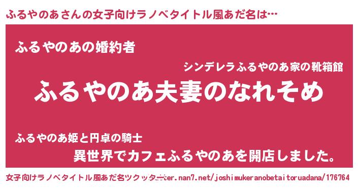 | 男性向けラノベタイトル風あだ名 | 『おまえをオタクにしてやるから、俺をふるやのあにしてくれ! 』 |