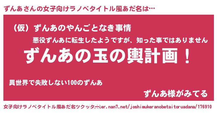 | 男性向けラノベタイトル風あだ名 | 『ずんあ~年齢イコール彼女いない歴の魔法使い~』 |
