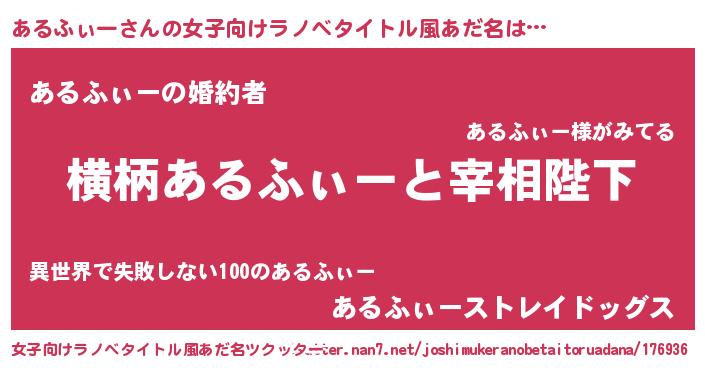 | 男性向けラノベタイトル風あだ名 | 『あるふぃーに滅ぼされるだけの簡単なお仕事です』 |
