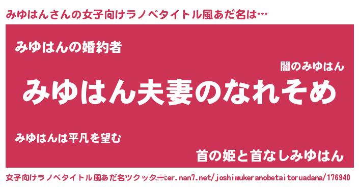 | 男性向けラノベタイトル風あだ名 | 『おまえをオタクにしてやるから、俺をみゆはんにしてくれ! 』 |