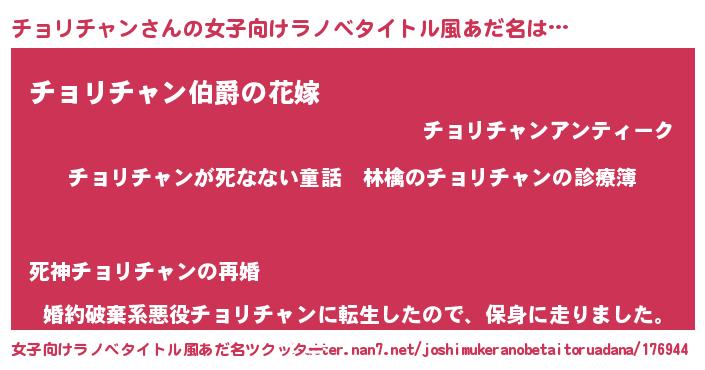 | 男性向けラノベタイトル風あだ名 | 『魔弾の王とチョリチャン』 |