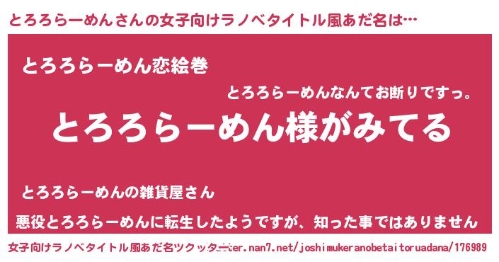 | 男性向けラノベタイトル風あだ名 | 『とろろらーめんの嫁は女の子じゃないと思った?』 |
