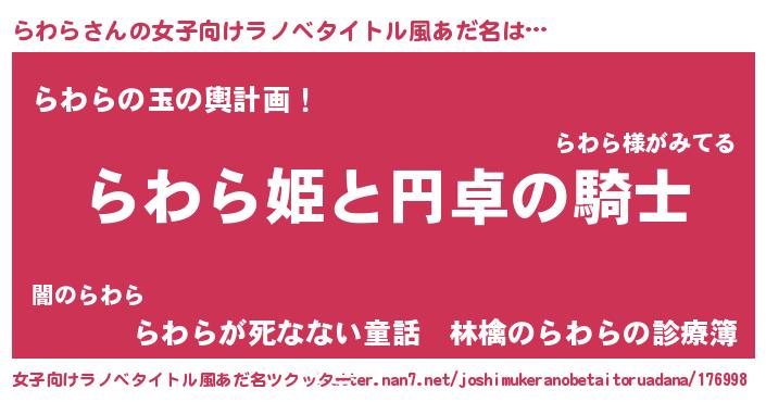 | 男性向けラノベタイトル風あだ名 | 『らわらの憂鬱』『魔弾の王とらわら』 |