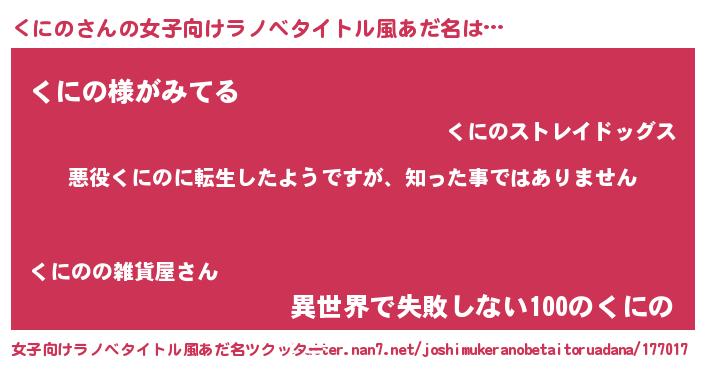 | 男性向けラノベタイトル風あだ名 | 『この素晴らしい世界にくにのを!』 |